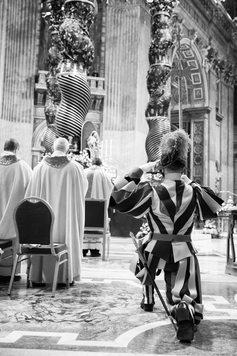 Soldats, matadors, bergers, pèlerins et clowns constituent en effet autant de présences et d'expressions de courage, de dévouement, de sacrifice et de fraternité d’âme. Alliant le caractère militaire au cadre éminemment spirituel qui lui est propre, la Garde Suisse Pontificale a fourni à son tour à Jean-Dominique une exceptionnelle matière première lui permettant de traiter directement la question du visible et de l’invisible : l’âme de la plus vieille armée du monde.