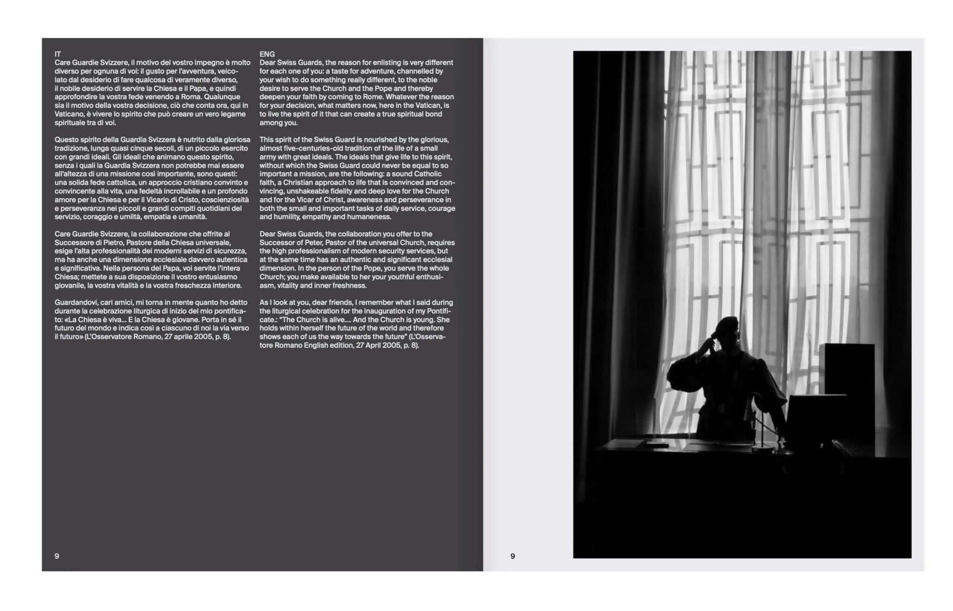 La direction artistique de ce livre d’Art : “Garde Suisse, Intimité” à été confiée à Duncan Whyte, ce livre est constitué d’environ 200 photographies, de textes des Papes adressés à la Garde ainsi que de textes introductifs de Fabrice Hadjadj, du Colonel Commandant de la Garde : Christoph Graf, du Caporal Eliah Cinotti et de l’aumônier de la Garde le P. Kolumban Reichlin.